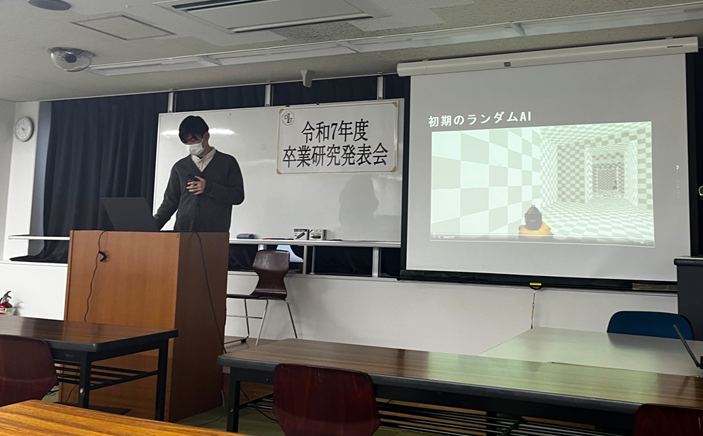 卒業研究では、研究内容だけでなく、1年間の成果を限られた時間の中で分かりやすく伝えるプレゼンテーション力も求められます。やや緊張した様子が見られたチームもありましたが、いずれの発表においても、自分たちの研究テーマの面白さや取り組む上での難しさを、自信をもって丁寧に報告していました。 学生一人ひとりの成長が感じられる、有意義な発表会となりました。