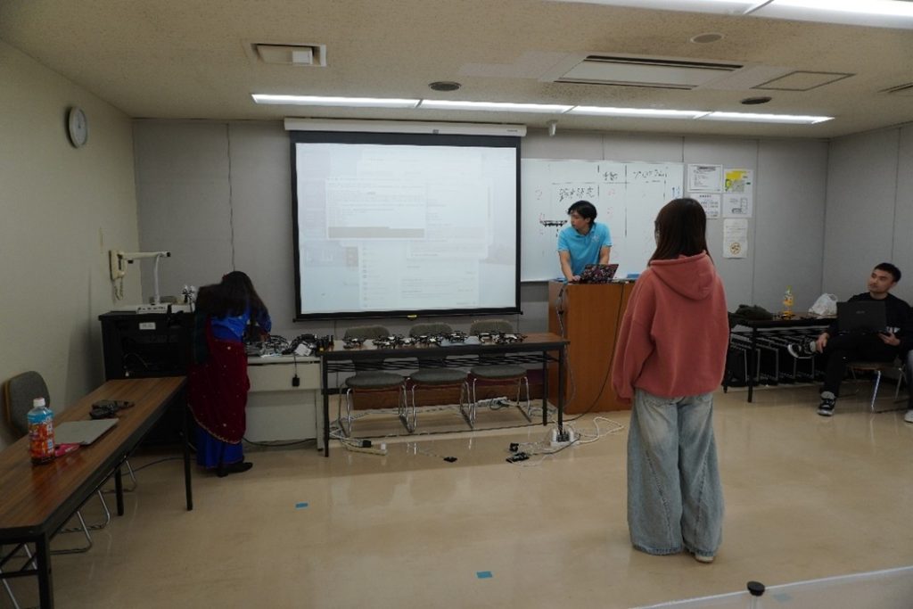 展示では、6台のドローンを同時に飛しょうさせて、曲芸(1回転)する展示、ドローンの追従、ジェスチャーによるドローン操作を行う展示をしました。